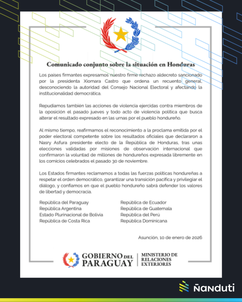 “Reafirmamos el reconocimiento a la proclama emitida por el poder electoral competente sobre los resultados oficiales que declararon a Nasry Asfura presidente electo de las República de Honduras”, reza parte del comunicado.
